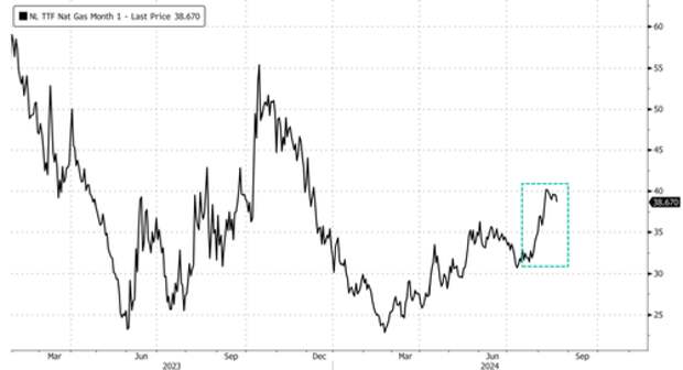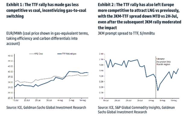 However, prices have since receded, with Goldman's Samantha Dart telling clients Monday that the price rally is mostly "overdone."Last week, Ukraine’s president claimed that troops have control over the Russian town of Sudzha, about six miles inside Russian territory. Within the town is a critical gas measuring station where NatGas flows from West Siberian gas fields through pipelines that pass through Sudzha and cross into Ukraine and then into utilities in Austria, Slovakia, and Hungary.