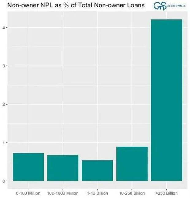 The biggest banks are definitely the ones which are having NPL issues at the moment, which is even more visible when we look at the Non-farm Nonresidential Non-owner occupied component of CRE. This component is crucial, because a CRE loan is classified as a Non-farm Nonresidential Non-owner occupied if the borrower is making payments primarily from rental income, hence this category is very sensitive to any issue in the sector.