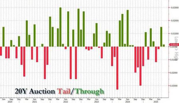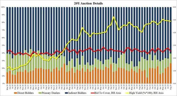 With bond yields sliding thanks to the ongoing stock drawdown, there wasn't many concerns about demand for today's 20Y auction. And rightly so, because the sale of $16 billion in 20 year bonds went through without any difficulty amid solid, if hardly stellar, demand.