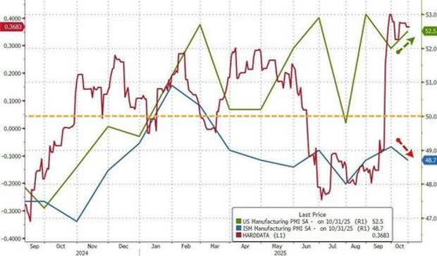 Following better-than-expected prints across Europe, and beats in Brazil and Canada, this morning's S&P Global US Manufacturing PMI rose more than expected to 52. 5 (52.2 exp), up from 52.0 - tracking hard data higher.