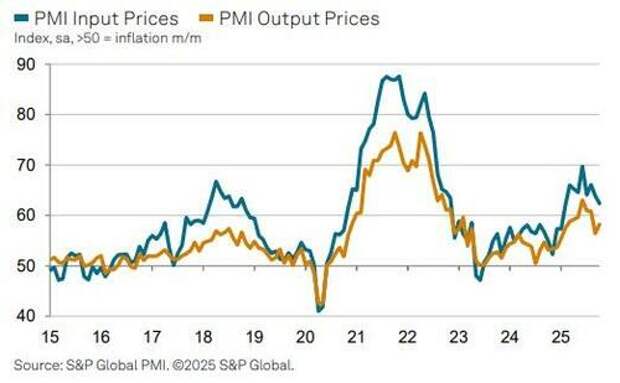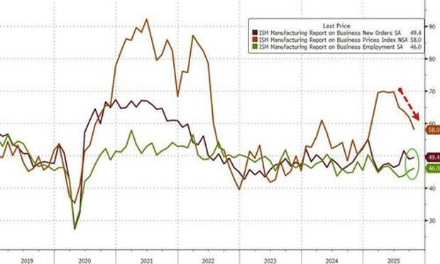 The index of prices paid for raw materials fell 3.9 points to 58, the lowest since the start of the year. Since a recent peak in April, during the height of the tariffs rollout, the price gauge has dropped nearly 12 points...