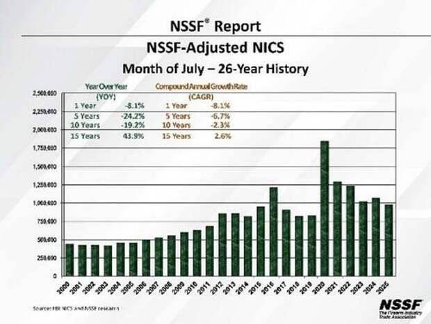 The latest July figures from the FBI show 1.94 million National Instant Criminal Background Check System (NICS) background checks, down 4.2% from July 2024. After removing permit-related checks, the National Shooting Sports Foundation (NSSF) estimated 978,731 checks directly tied to gun sales, an 8.1% drop year-over-year and the first sub-million reading in six years.