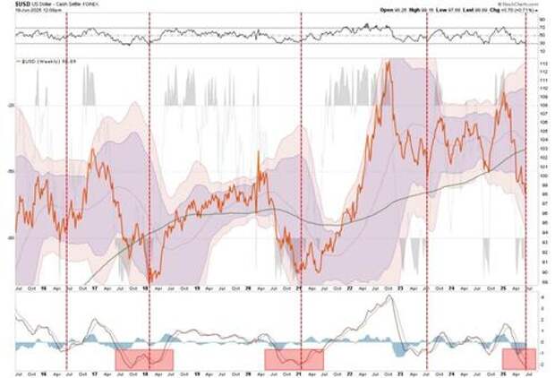 This isn’t the first time the “dollar’s death” has made the news. In 2022, “de-dollarization” narratives filled the bearish narratives, with everyone saying the dollar’s death was imminent. Yet, that “frenzy of doom” marked the bottom of the dollar before a robust rally. We could be setting up for another similar rally for two reasons.