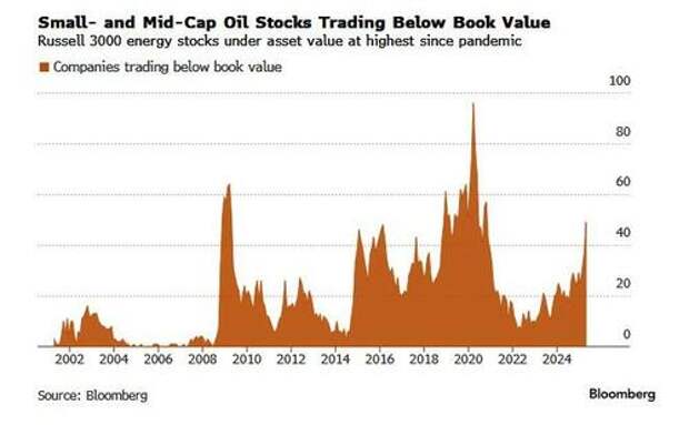 ... one would think that there is nothing in the market that a value investor would find attractive. One would be wrong: almost half of all mid- and small-cap oil and gas stocks in the US are now trading below their book values. That’s the highest level since the pandemic. And according to Bloomberg, it’s a gift for value investors worshiping the gospel of Warren Buffett and his mentor Ben Graham, who referred to these kinds of opportunities as “cigar butts.”