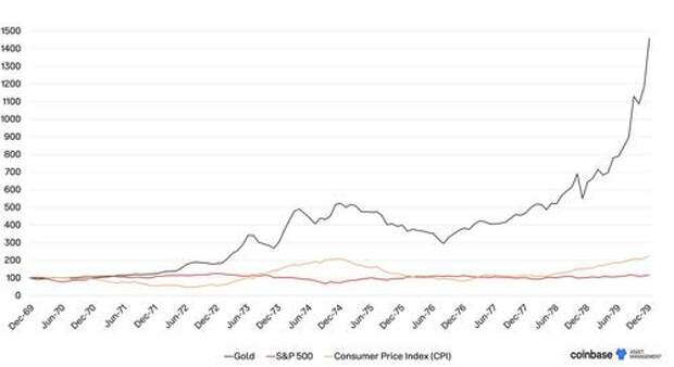 How does crypto perform in an inflationary recession? An all-weather asset akin to gold. In the 1970s, gold's value rose more than ten-fold. Despite painful recessions in the 1970s, where gold fell almost 50%, like in 1974, the asset provided protection that traditional ones couldn’t. The S&P 500 remained largely unchanged in the decade, but a massive real devaluation given the doubling in consumer prices. Gold enhanced buying power for the next cycle.