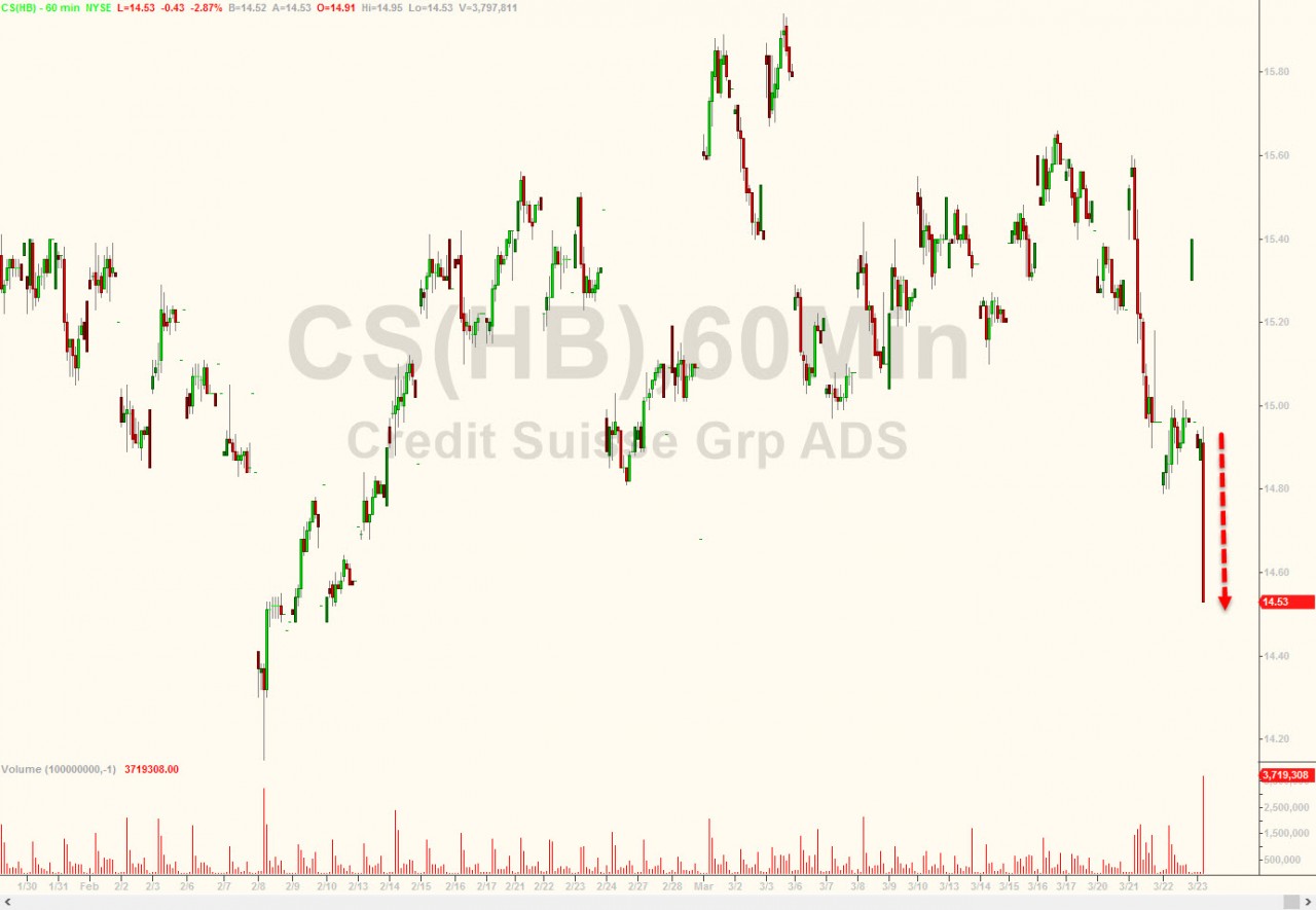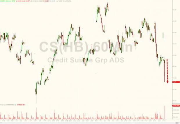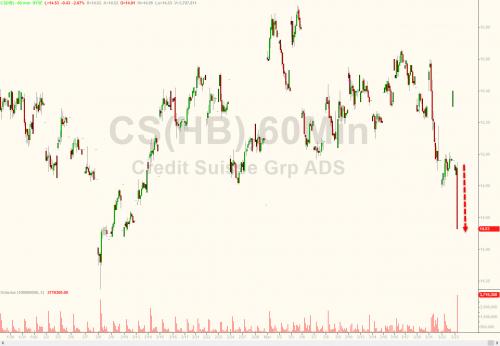 First Deutsche Bank, now Credit Suisse: according to Bloomberg, the second largest Swiss bank, is also preparing to take advantage of euphoric markets and is considering selling stock valued at more than 3 billion Swiss francs ($3 billion) as it seeks to boost capital levels. The news sent the stock sliding.