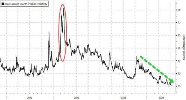 Crude prices remain lower this morning ahead of the official inventory data - though continuing yesterday's somewhat chaotic intraday swings. This is notable as oil options markets are pricing in the lowest volatility in six years - despite the potential geopolitical chaos.