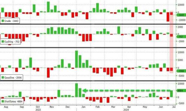 The official data confirmed an even larger crude inventory draw. Distillates stocks rose more than exp3ected - perhaps drioven by refinery outages from Beryl....