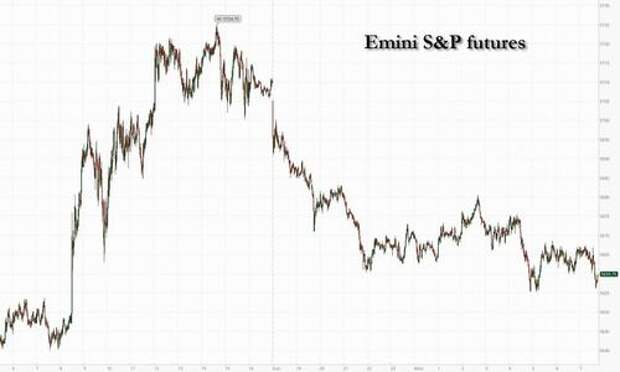 US equity futures are lower after the S&P gained 2.9% last week and erasing all post-Liberation Day losses. As of 8:00am, S&P futures were down 0.9%, putting the index on track to snap its longest streak of gains since 2004; Nasdaq futures dropped 1.