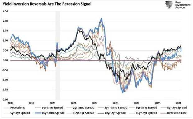 Then there is the yield curve. After a prolonged inversion that began in 2022, the curve’s re-steepening in late 2024 and into 2025 prompted some relief among investors who viewed the normalization as a sign the recession everyone feared had been avoided. But historically, the most dangerous period for equities is not during the inversion itself; it is in the 12 to 18 months after the curve un-inverts. The logic is straightforward: the curve steepens because the Fed is cutting rates in response to slowing growth, and the lagged effects of prior tightening are still working through the economy. By the time the damage becomes visible in earnings, the market-topping process has likely been completed.