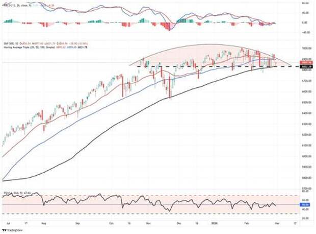 The bull trend is intact, but the “easy money” phase appears mature. The intermediate-to-long-term structure remains constructive. The 200-DMA is rising, breadth is near record levels, and the rotation trade is broadening participation. However, short-term momentum has deteriorated notably. The index is below both its 20- and 50-DMAs, the MACD has crossed bearishly, and the RSI is declining. Layer in the midterm election year seasonal headwinds, hotter-than-expected inflation, and Iran-related geopolitical risk, and the path of least resistance in early March tilts toward further consolidation or a modest pullback before the seasonal tailwinds attempt to reassert themselves. I suspect we will get a better entry point for a rally as we move into March. However, use that opportunity to rebalance oversized winners, define risk levels, and avoid chasing strength. Don’t fight the trend, but protect gains if volatility inevitably returns.