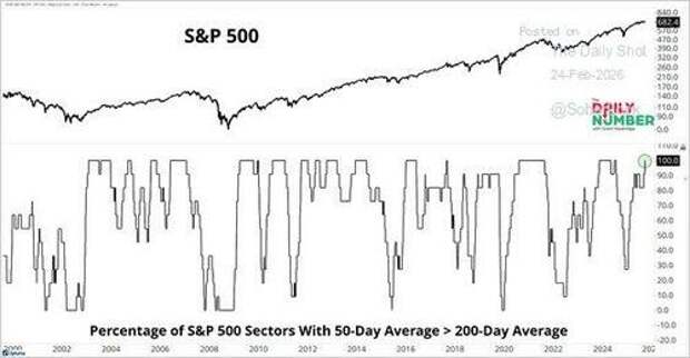 The big risk worth watching is that tariff policy remains in legal limbo after the SCOTUS ruling. The AI disruption narrative is broadening beyond software into financials and logistics. And the extreme rotation into Energy, Materials, and Industrials (up 21%, 17% and 12% respectively) has left positioning dangerously one-sided against Technology.