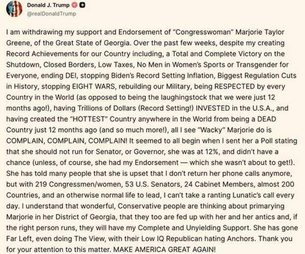 Not long after his Massie post, Trump dropped a nearly-300-word rant assailing "Wacky Marjorie," and announcing he was withdrawing his "support and endorsement" of Greene. Trump claimed that Greene's complaints about Trump's policies spring from when Trump sent her a poll "stating that she should not run" for governor or the Senate, adding that he's heard Greene is "upset that I don't return her phone calls anymore." The president said he stands ready to give the "right" Republican primary challenger of Greene his "Complete and Unyielding Support."