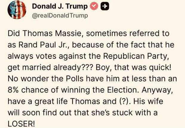 Posting on his Truth Social account, Trump's first attack targeted Massie, whom the president has repeatedly denigrated going back to his first administration. The twice-divorced and alleged-repeat-philanderer Trump suggested Massie remarried too quickly after his wife died in June 2024; the libertarian-minded Kentuckian married a former Rand Paul staffer last month. Trump implied the marriage was hurting Massie's 2026 political prospects, claiming "polls" give Massie "less than an 8% chance" of being re-elected. ZeroHedge was unable to find a published poll that aligns with that characterization. Massie won his last three primaries handily, amassing more than 75% of the vote in each one.