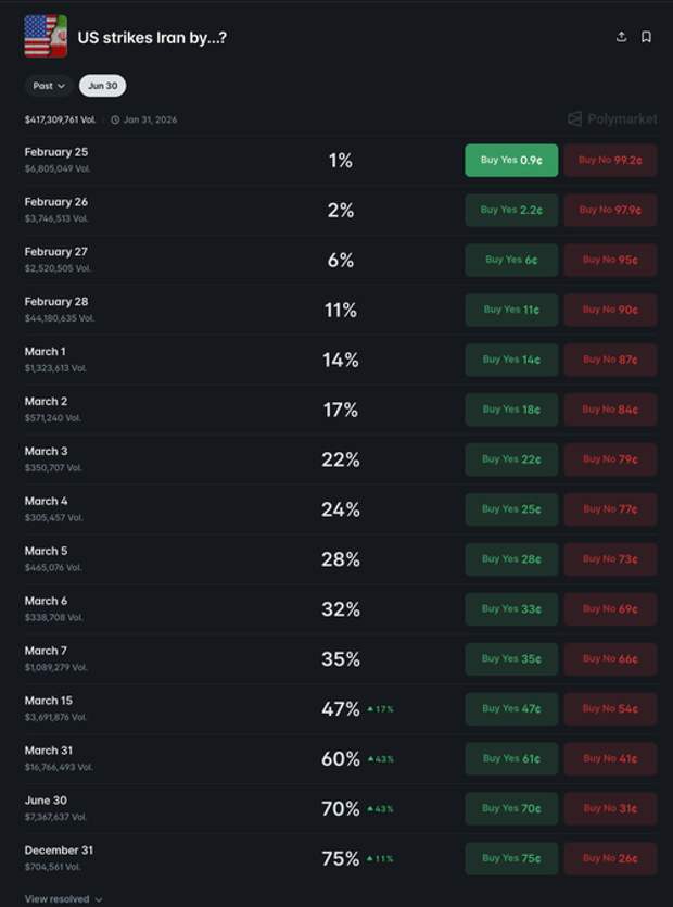 Latest Polymarket pricing for "US strikes Iran by...?" implies a 47% probability of a U.S. military strike by March 15.