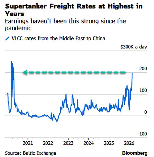 Bloomberg reports that Bahri, the National Shipping Co. of Saudi Arabia, chartered five VLCCs to transport up to 2 million barrels from the Middle East to China at a rate of $200,000 per day. According to the Baltic Exchange in London, that is the highest rate in six years. One of the ships Bahri chartered, the DHT Jaguar, was booked at $208,000 per day.