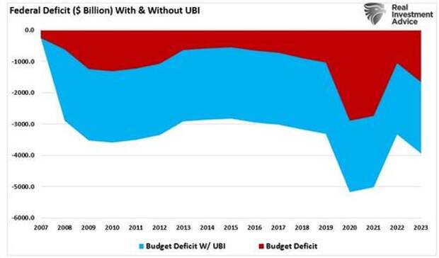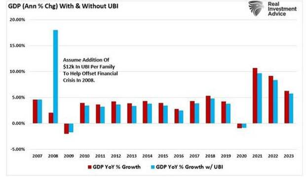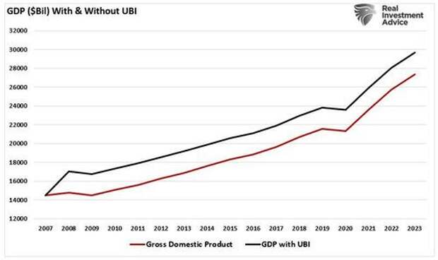 The chart below shows the economy’s annual GDP growth trend, assuming the entire UBI program contributes to economic growth. For those supporting programs like UBI, it certainly appears as if GDP is permanently elevated to a higher level.