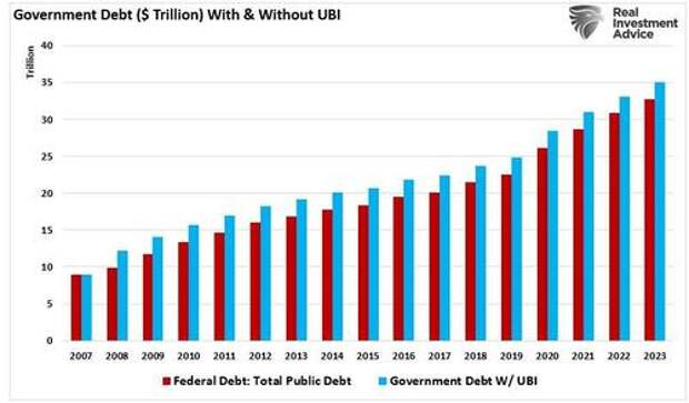 While UBI, along with free healthcare, education, childcare, etc., sounds great, they are NOT productive investments with a higher return than the carrying cost of the debt. History suggests these welfare supports have a negative multiplier effect on the economy.