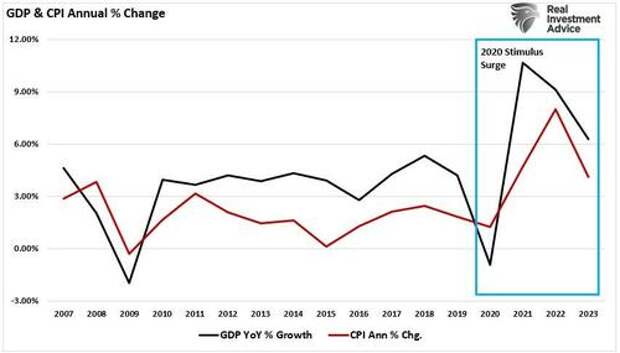 However, such is a bit deceiving. When we examine the annual rate of change in economic growth, which is how we measure GDP for economic purposes, a different picture emerges. In 2008, when the initial $12,000 arrived at households, GDP spiked, printing a 17% growth rate versus the actual 1.81% rate. Such would be expected as consumers spend the additional income. (The spike in GDP In 2021 was due to the stimulus payments during the Pandemic.)