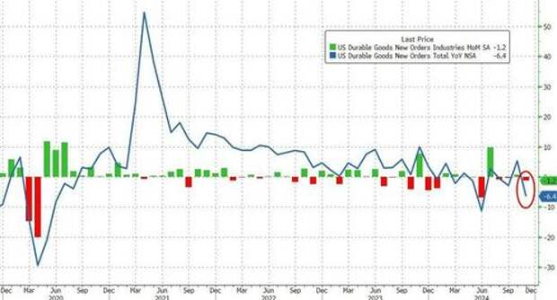 4% decline expected) with core Durables (ex-Transports) falling 0.2% MoM in November. The headline MoM drop dragged the YoY change in Durable Goods Orders down 6.4% YoY - the second worst since COVID lockdowns...Source: Bloomberg