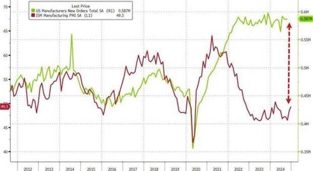 Finally, what the f**k is going on here? 'Hard' manufacturing orders data is completely decoupled from 'soft' manufacturing survey data...