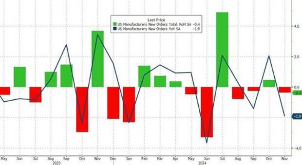 US Factory Orders tumbled 0.4% MoM in November (from an upwardly revised +0.5% MoM change in October), dragging orders down 1.9% YoY (the worst since June)...