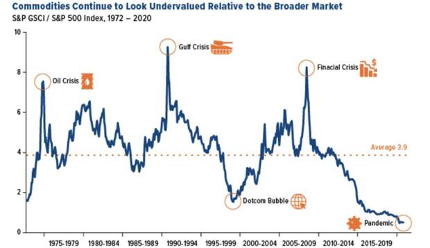 Jim highly recommends precious metals and other commodities as an important part of the solution. As an overall index, commodities are the cheapest they’ve ever been vs the general stock market in over half a century: