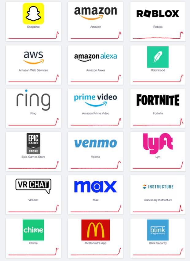 - Widespread slowdowns and outages are being reported across major platforms that depend on Amazon's cloud, including Snapchat, Roblox, Amazon Alexa, Fortnite, Ring, Robinhood, Venmo, Lyft, and many others.