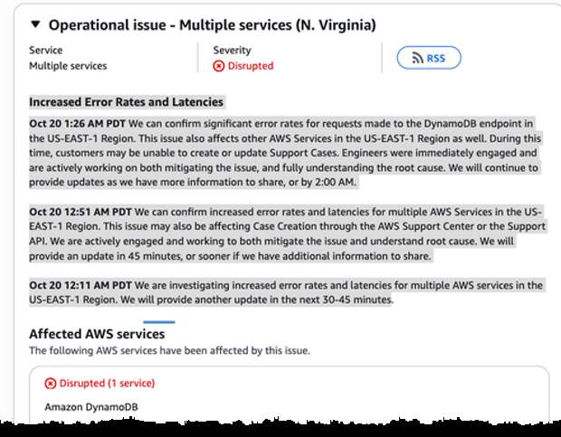 AWS' Service Health Dashboard shows "operational issues" in its US-East-1 region (Northern Virginia), one of its largest data centers.