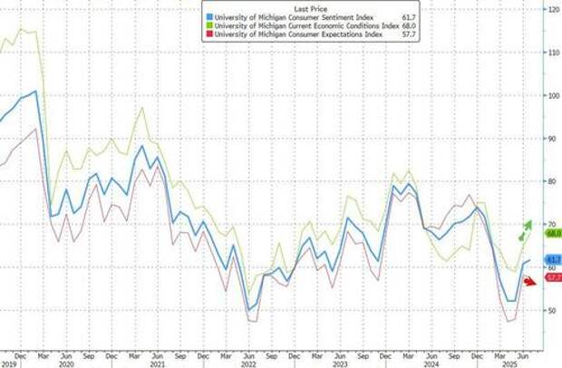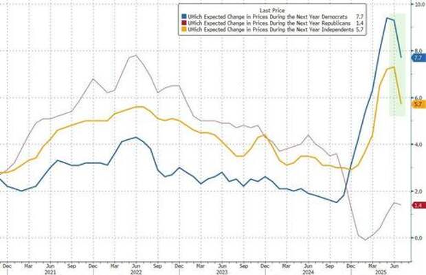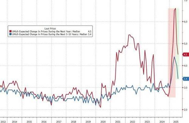 Most notably, inflation expectations plunged. Consumers expect prices to rise at an annual rate of 3.4% over the next five to 10 years, the tamest since January, data released Friday showed. They saw costs rising at an annual rate of 4.5% over the coming year, down from 5% in June...