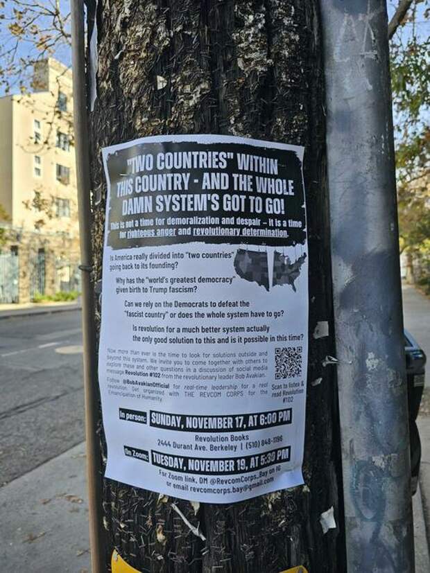 "Two Countries" Within This Country—And The Whole Damn System's Got To Go!" the title of the poster reads. It states there will be an in-person meeting to plan for revolution at a Berkeley bookshop on Sunday evening and a Zoom meeting on Tuesday.