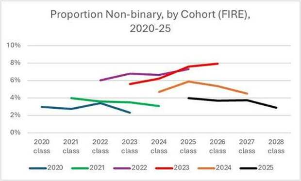 Not only this, but freshmen in 2024-25 were less trans and queer than seniors whereas it was the reverse when BTQ+ identity was surging in 2022-23. This suggests that gender/sexual non-conformity will continue to fall.