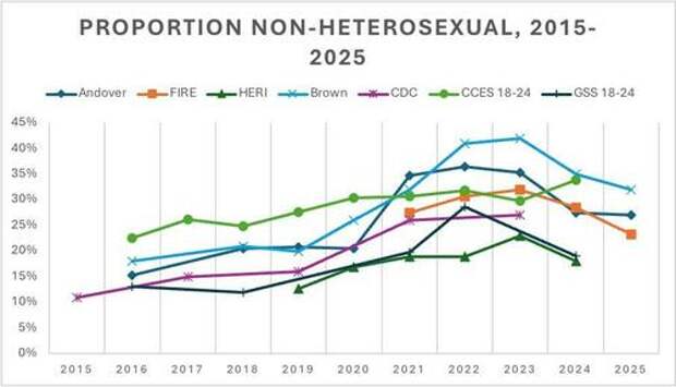- Among U.S. university students, the transgender share fell from ~7% in 2023 to under 4% in 2025. Non-heterosexual identification dropped by about 10 points in the same period.