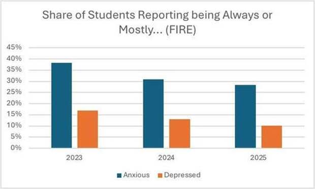 Is it improved mental health? Yes, in part. Less anxious and, especially, depressed, students is linked with a smaller share identifying as trans, queer or bisexual.