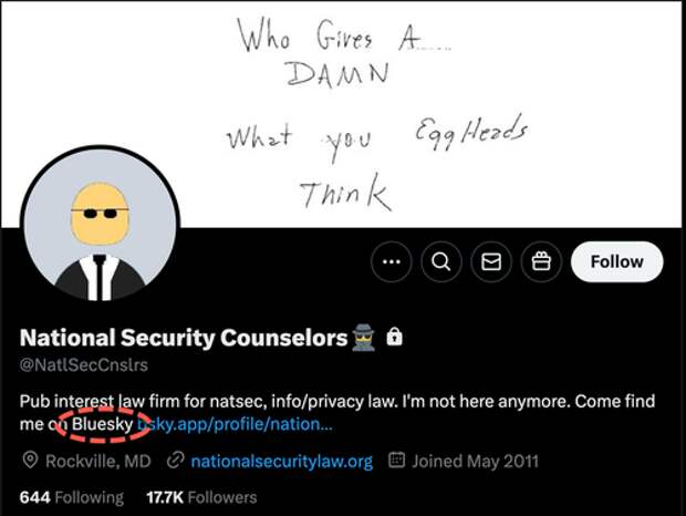 On X, the account featuring National Security Counselors stated, "Pub interest law firm for natsec, info/privacy law. I'm not here anymore. Come find me on Bluesky."