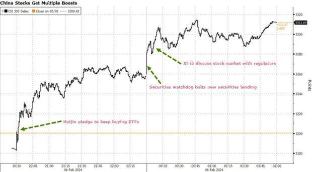 After tumbling the prior day following remarks on heavy tariffs from presidential front-runner Donald Trump, Chinese stocks rallied significantly across the board overnight after reports that regulators planned to brief President Xi Jinping on the financial market as soon as Tuesday.