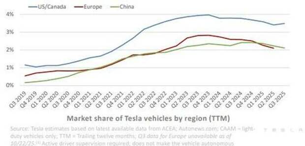 Tesla’s own market share chart in its earnings release shows the slowdown that’s beset the EV maker around the world, particularly in Europe and in China.