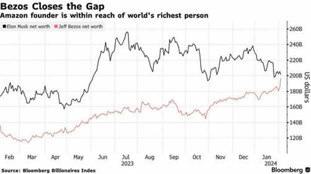 Bloomberg notes that the distance in net worth between Bezos and Musk is closing as Amazon and Tesla exhibit divergent trajectories. Amazon's stock has surged amidst a tech rally that propelled US stock indices to record levels, while Tesla has faced challenges from regulatory investigations, price cuts, falling margins and increasing competition.