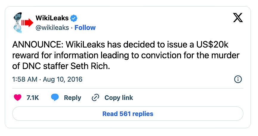 On the same day of the Dutch TV interview, WikiLeaks offered a $20,000 reward for information leading to the solution of the mystery of who killed Rich.