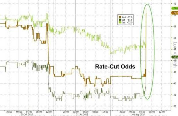 Weaker than expected job gains combined with rising unemployment rates and massively negative revisions have sent rate-cut odds soaring with September now priced around 75%...