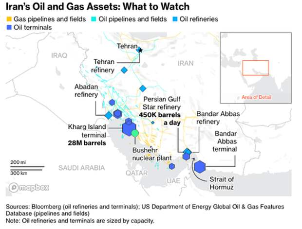 Here’s a map showing Iran’s major energy installations, including oil and gas fields, pipelines, refineries and storage terminals: