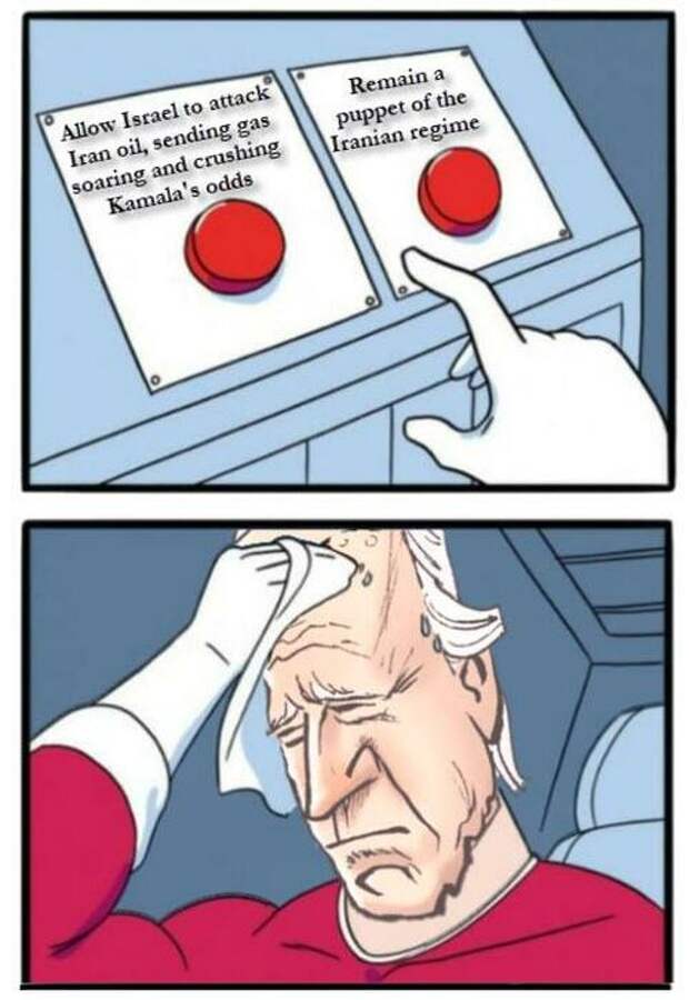 Summary: Biden is now boxed in. Either he puts taxpayer money where his diplomatic mouth is, and sides with Israel in attacking Iran, sending the price of oil and gas soaring and crushing Kamala's election odds, or confirm he is a puppet of the Iran regime, which should remain untouchable until the elections to keep oil prices lower, rising a unilateral attack by Israel anyway, demonstrating to the world just how irrelevant he has become.