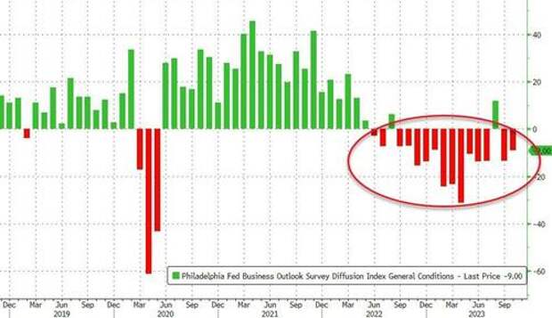 The headline Philly Fed Business Sector Outlook survey print was -9 in October, worse than the -7 expected, but a small bounce from the -13 print in September, as almost 35% of the firms reported decreases in general activity this month.