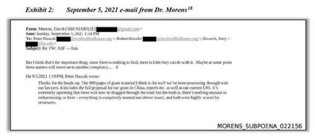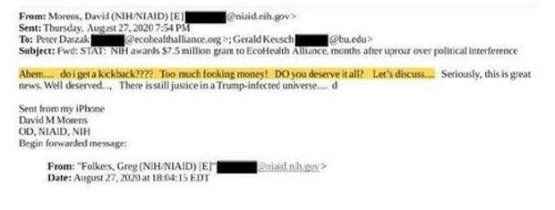 In another email to Daszak, Morens referenced an article headlined “NIH awards $7.5 million grant to EcoHealth Alliance, months after uproar over political interference” and directly asked for his own “kickback” for his role in assisting on the grant.