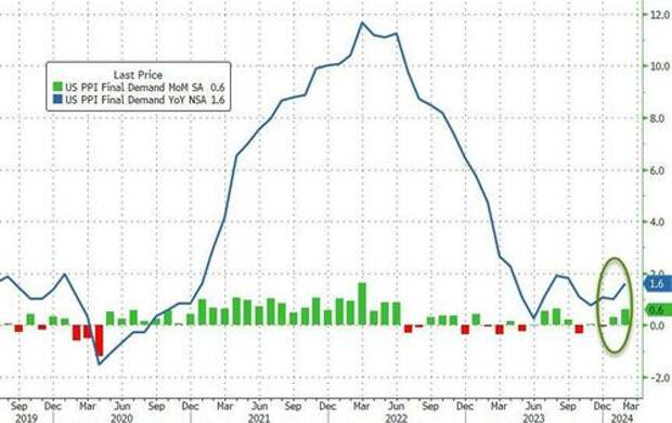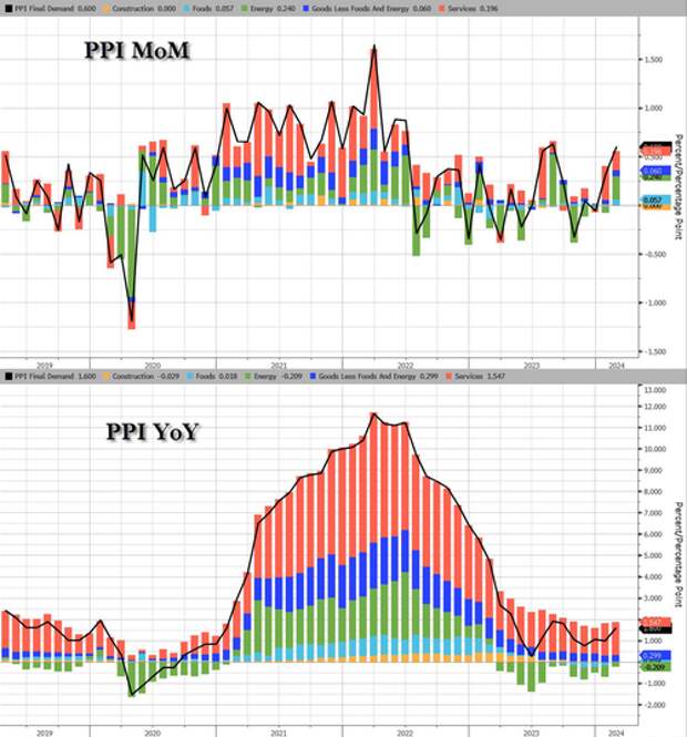 After the hotter-than-expected consumer price data, February Producer Prices were expected to slow their surge from January but they did not... with headline Final Demand PPI rising 0.6% MoM (double the 0.3% rise expected) - the hottest print since June 2022. That lifted the YoY PPI to +1.6%, its highest since September...