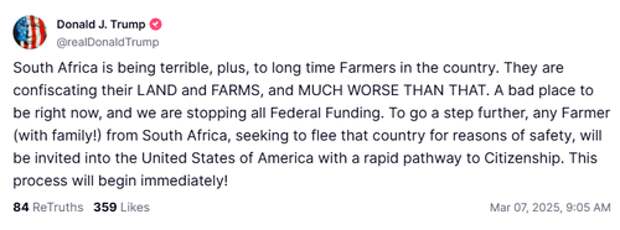 President Trump on Friday announced the stoppage of all federal funding and foreign aid to the country of South Africa. The State Dept order went out on Thursday, and on Friday Trump took to Truth Social to blast the country's "terrible" treatment of its farmers, which has included "confiscating their land and farms" and "much worse" (an apparent reference to the years-long trend of White farmers being killed).
