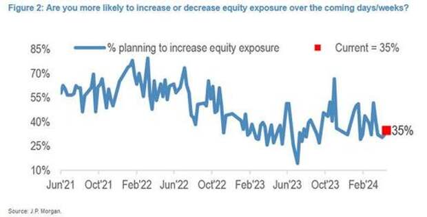 Fully elevated, eh? Funny he should say that, because just a few pages later in his own analysis, Kolanovic publishes this recurring chart showing how JPM clients see their positioning, and according to which just 35% plan to increase their equity exposure, which is tied for the lowest since last summer.