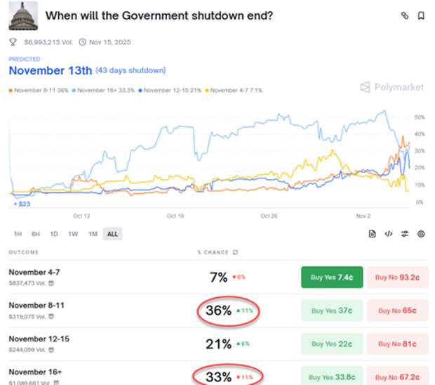 Latest Polymarket odds show just a 36% chance the government shutdown ends between Nov. 8 and Nov. 11.