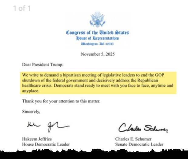"We write to demand a bipartisan meeting of legislative leaders to end the GOP shutdown of the federal government and decisively address the Republican healthcare crisis. Democrats stand ready to meet with you face to face, anytime and anyplace," Senate Minority Leader Chuck Schumer and Minority Leader Hakeem Jeffries wrote in a letter addressed to President Trump.