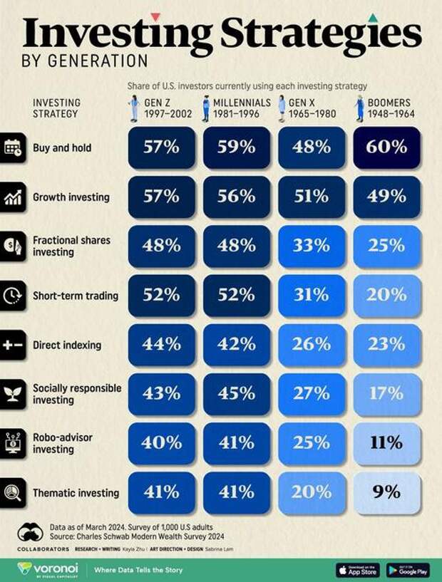 This graphic, via Visual Capitalist's Kayla Zhu, visualizes the breakdown of how each generation uses each of the following types of investing strategies: